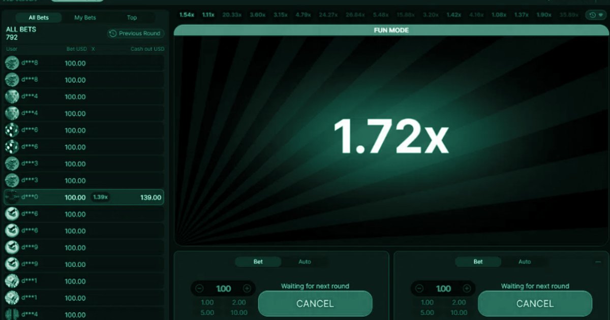 Ein Flugzeug startet. Der Multiplikator beginnt bei 1,01x und steigt. Irgendwann crasht der Flieger, und der Multiplikator ist weg. Wer vorher Cashout gedruckt hat, bekommt seinen Einsatz mal den Multiplikator. Wer zu spat druckt, verliert die Runde.